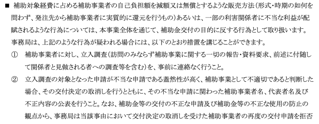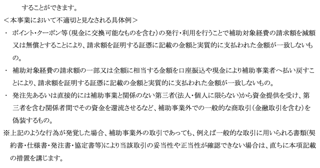 発注先から補助事業者に実質的に還元を行うものは、本事業の目的に反する行為。